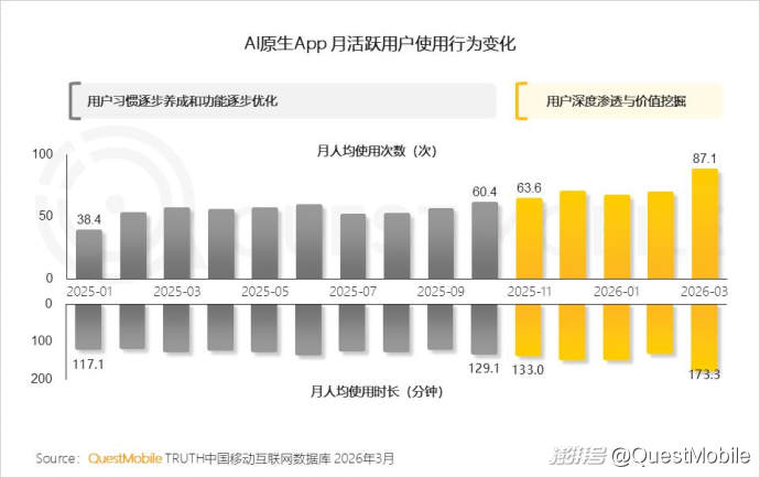 QuestMobile数据显示,今年3月AI原生App整体月人均使用次数达87.1次,较25年11月增长36.9%;月人均使用时长173.3分钟,较25年11月增长30.3%。