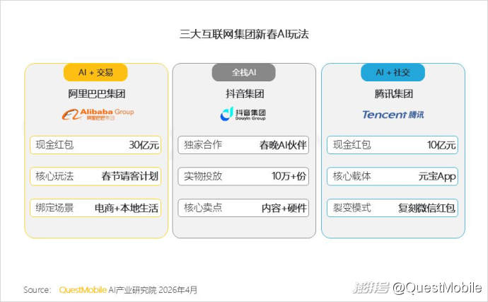 1、春节战场,阿里以交易激活消费,抖音借内容+硬件营造沉浸体验,腾讯凭社交链实现AI渗透;红包大战的背后,实则是AI落地场景的全面卡位