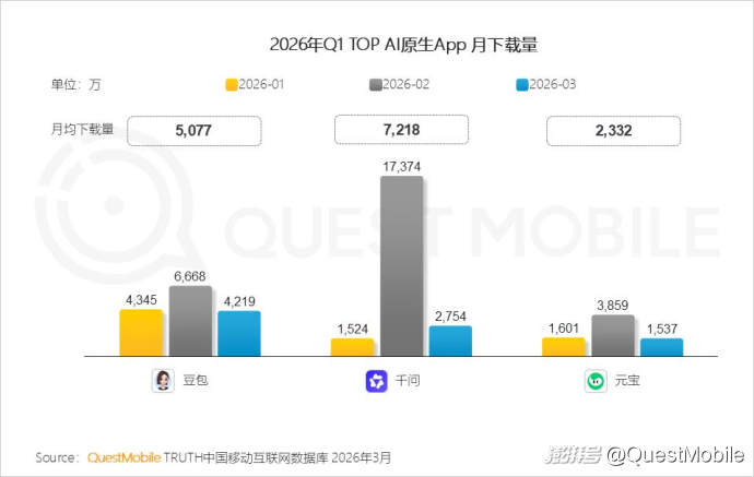 4、QuestMobile数据显示,今年2月,千问下载量达1.7亿,平均下载量达7218万;豆包进入“自然增长+品牌效应”的阶段