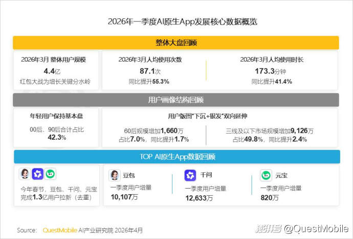 QuestMobile数据显示,截止到2026年3月,AI原生APP月活用户规模已达到4.4亿,其中,豆包、千问、DeepSeek位居前三位,月活用户规模分别为3.45亿、1.66亿和1.27亿,行业单季度新增超1.3亿用户。同时,三者在整个一季度的平均活跃率分别达到33.5%、17.1%、21%,显示出用户粘性在快速提升。