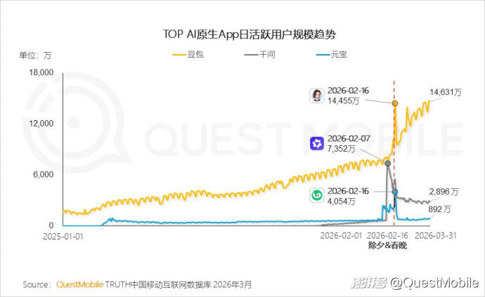 QuestMobile数据显示,春节高峰过后,豆包DAU维持在1.4亿左右,千问和元宝分别维持在3000万和900万。