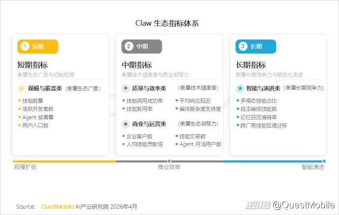 6、当前Claw生态仍在规模扩张阶段,以技能数量、开发者数、部署量为核心指标,网络效应正在积累,但尚未进入质量与智能的深水区