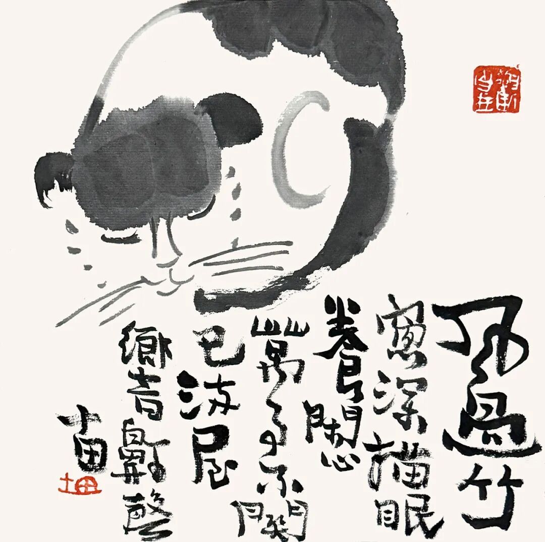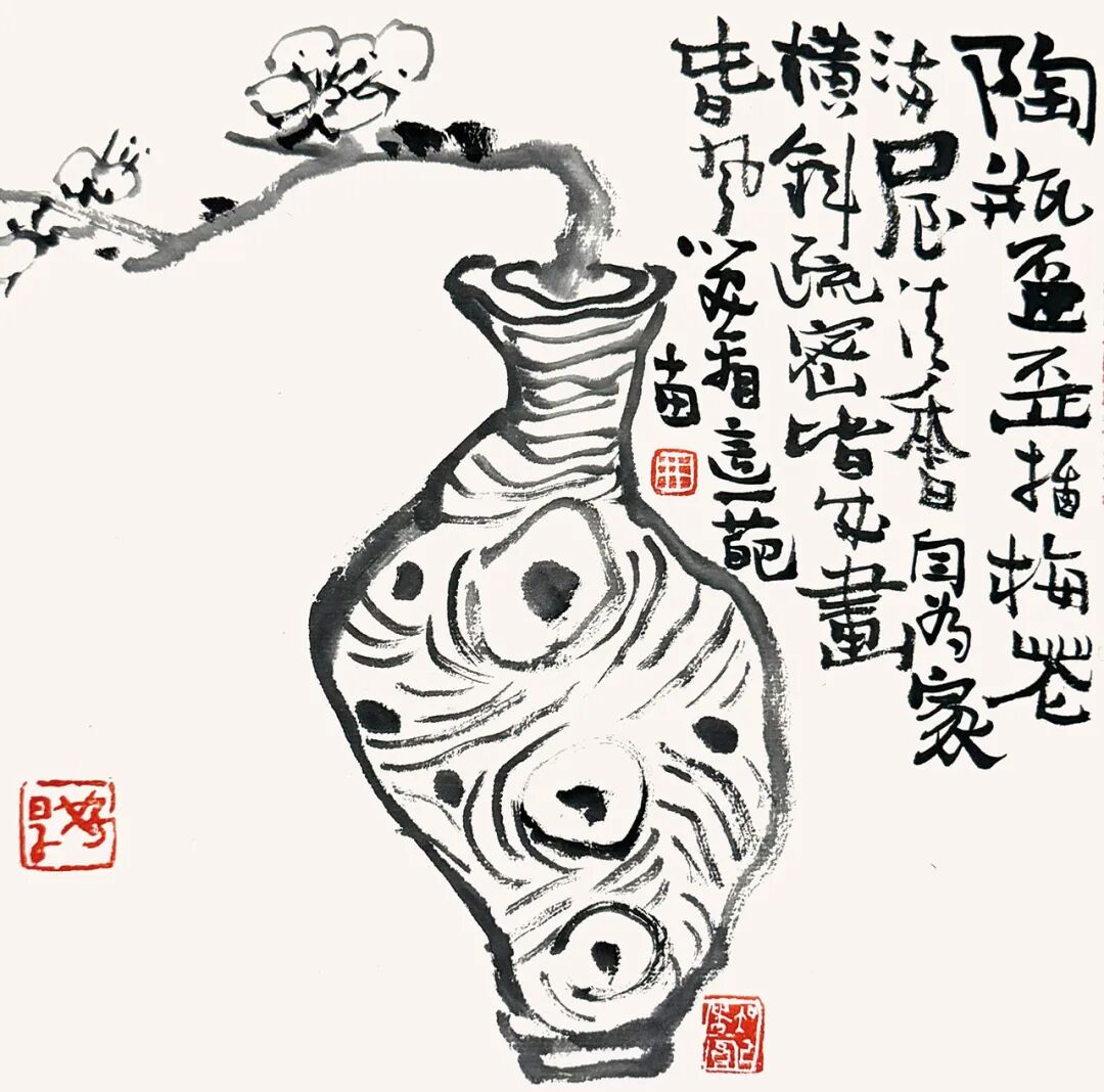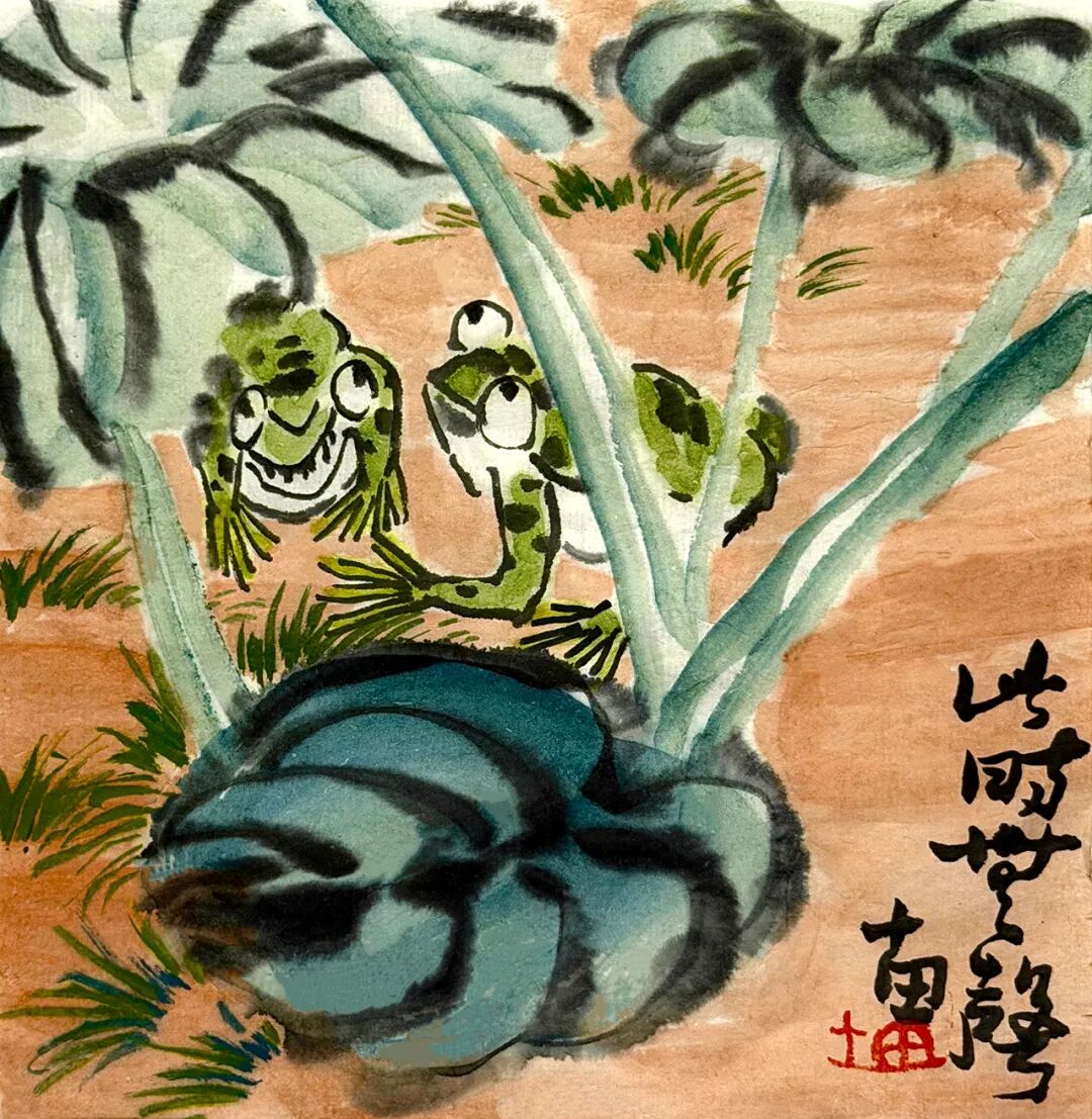 不是笨拙的拙,而是洗尽机巧之后返归本真的那种沉静、朴厚、带骨力的生趣。当下太多书画家满纸云烟,却空无一物;技法娴熟,却如在真空里打转。而十田先生的画,哪怕只是一颗南瓜、一只陶罐、几笔枯荷,都稳稳地立于纸上——那是四川大竹的泥土滋养出的底气,是十六年军旅生涯磨砺出的筋骨,更是他日日面壁笔墨、不趋时风的定力。