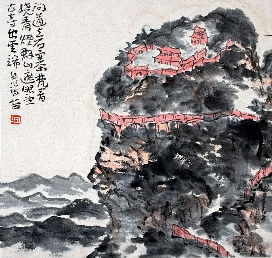 古寺出云端-17x17cm-纸本设色