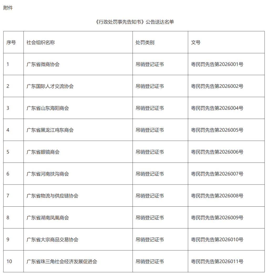 “广东省微商协会”等10家社会组织拟被吊销登记证书