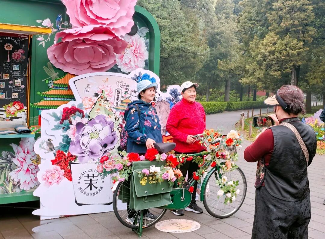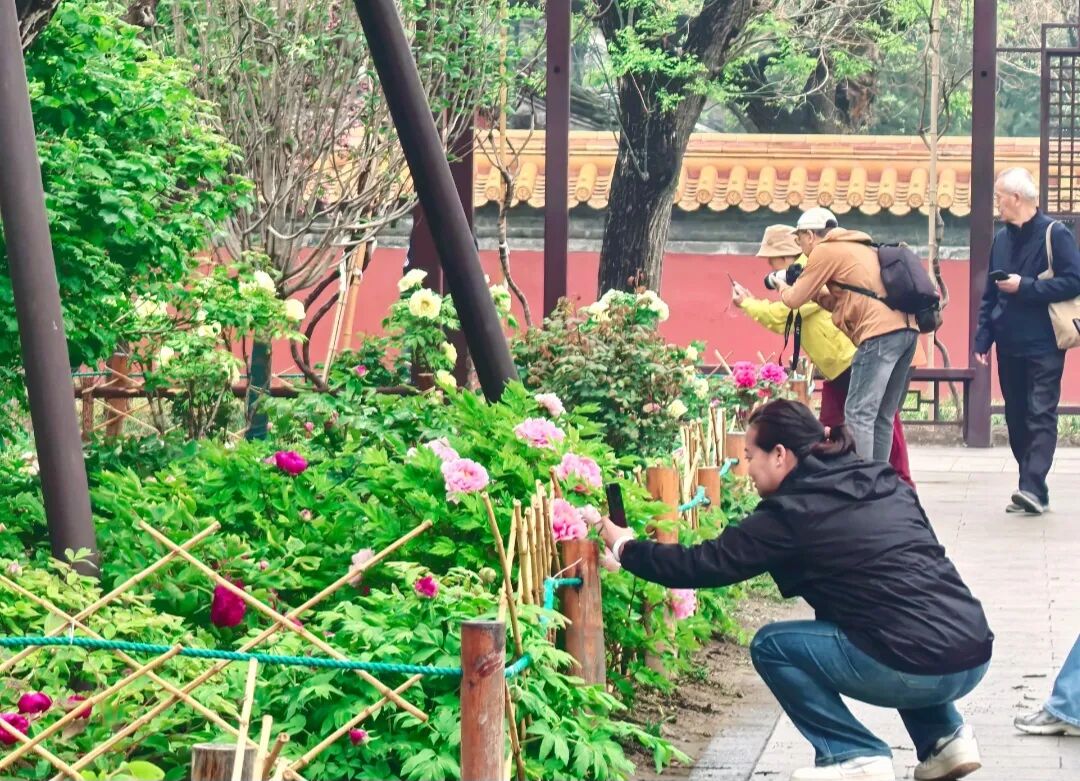 步入景山公园前山,两侧对称延展的“牡丹路”视野开阔,步移景异。眼下,红的、粉的、绿的牡丹开得正盛,与近处的绮望楼、高处的万春亭这些老建筑一同入画——红墙作底,花影为墨,随手一拍就是一张“古风大片”。无论是花瓣上跳跃的光斑,还是古建飞檐下一抹雍容的国色,都让市民游客忍不住举起手机或相机。