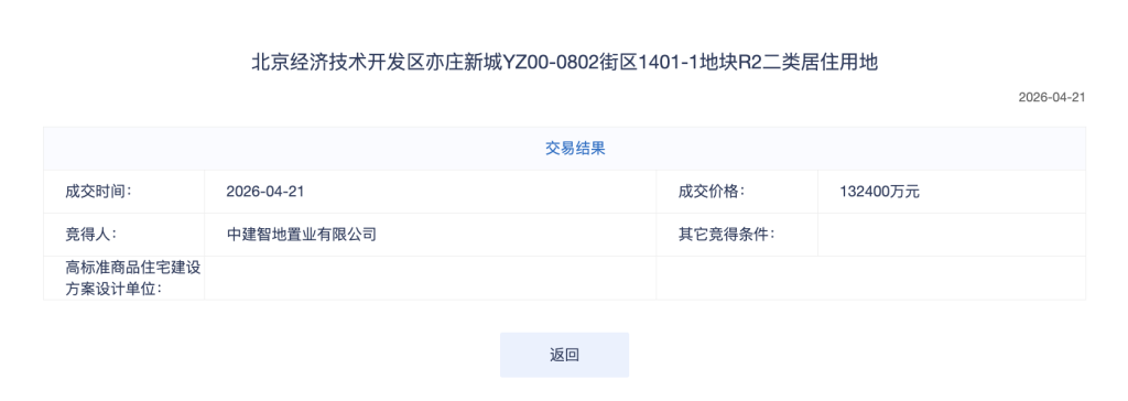 中建智地13.24亿元竞得北京亦庄新城宅地,溢价率8.7%