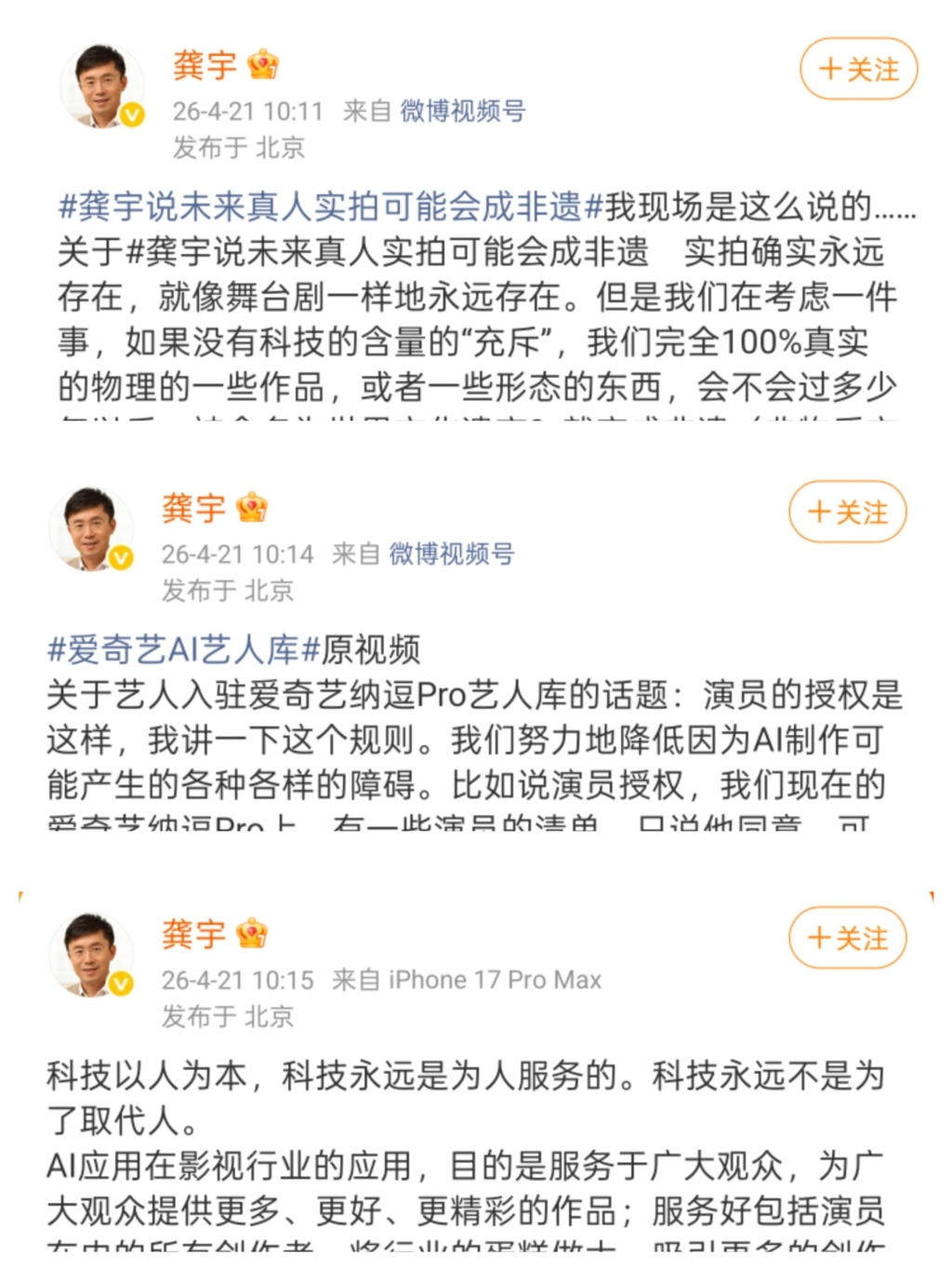 4月21日上午10时许,爱奇艺创始人兼CEO龚宇在五分钟内连发三条微博,就“AI艺人库”争议进行集中回应,相关话题迅速冲上热搜。而在当天凌晨,爱奇艺官方已再次发布声明,重申“纳逗Pro艺人库”的合作原则,强调不存在未经艺人同意将其纳入库中的情况。这一系列回应,源于前一日该公司关于“已有超百位艺人签约入驻AI艺人库”的消息一发布,立刻引发广泛争议,随后有多位艺人紧急发文否认签署过任何AI相关授权。