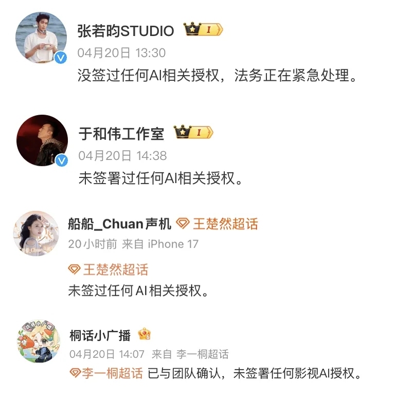 多位艺人工作室发布声明表示未签署任何AI授权。