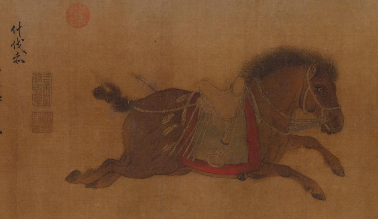金代画家赵霖的《昭陵六骏图》卷,则将唐太宗李世民为纪念开国征战而镌刻于昭陵墓道的六匹战马——飒露紫、拳毛騧、白蹄乌、特勒骠、青骓、什伐赤——从石刻转化为绢本长卷。