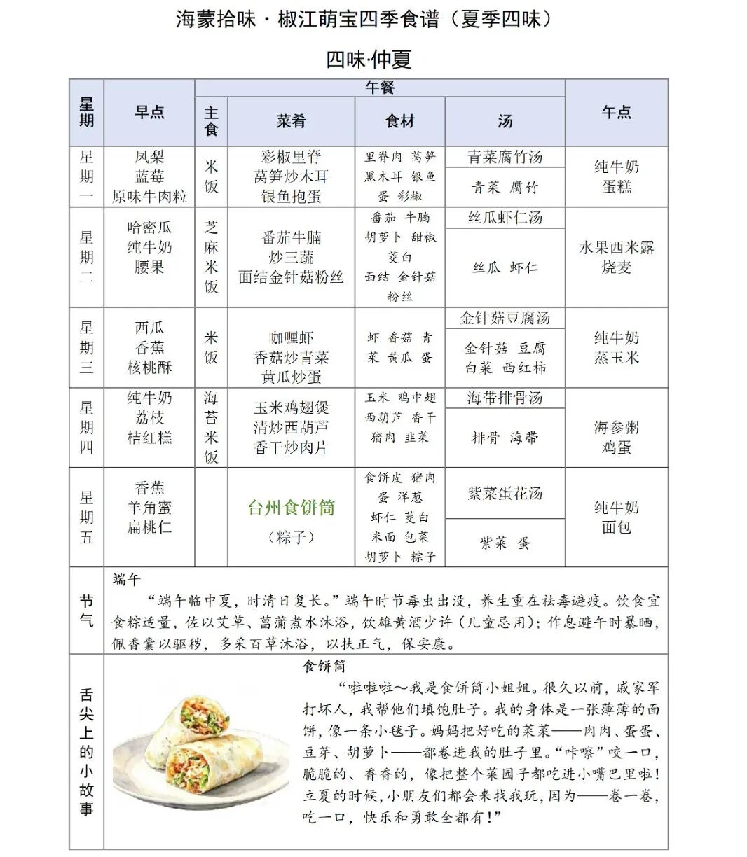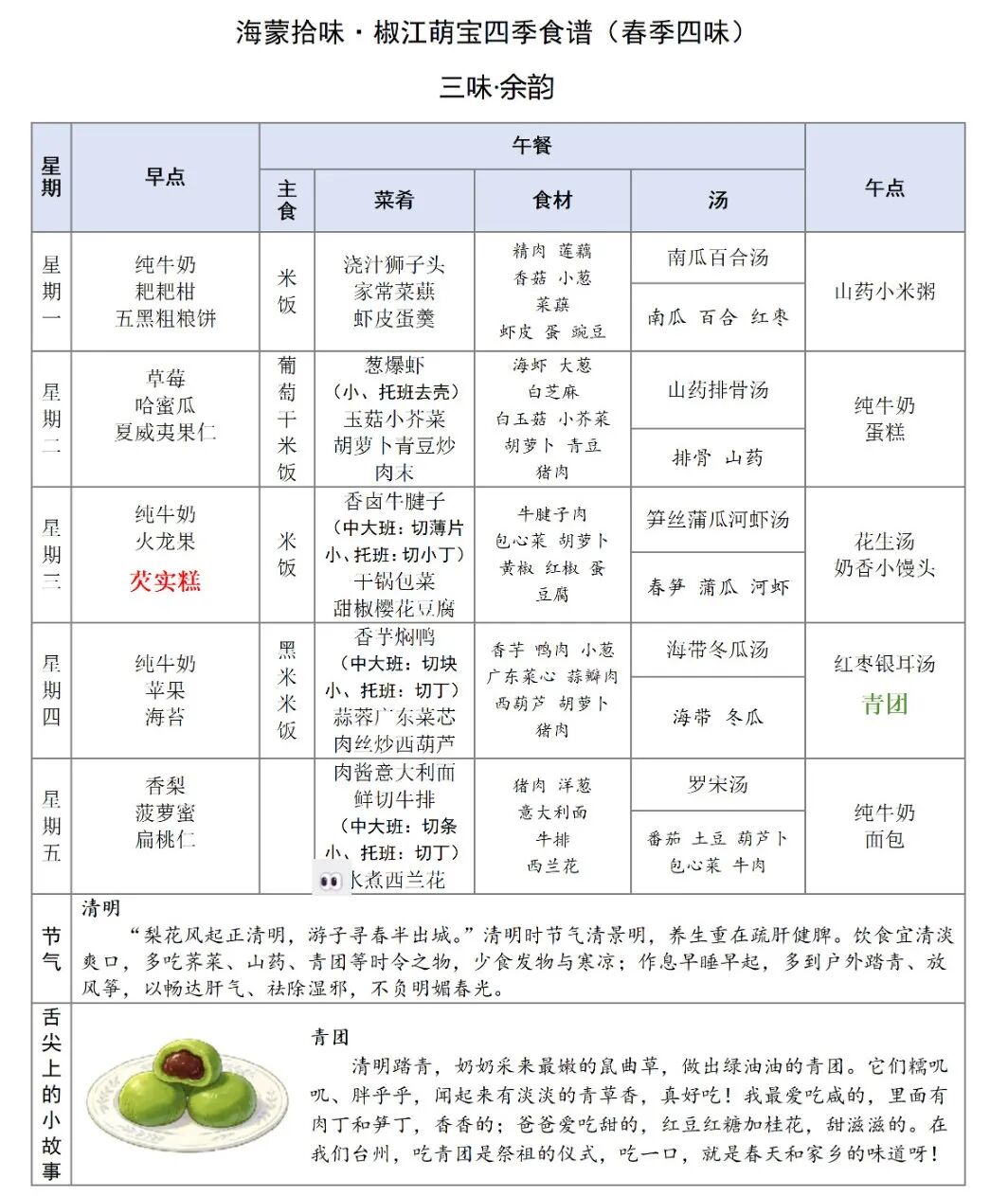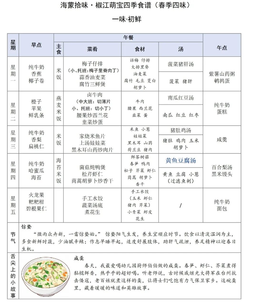 “糯叽叽、鲜哒哒”的本土风味,是这份四季食谱最具温度的亮点。椒江将本地饮食文化融入膳食设计,搭配本土美食小故事,让食育不止于营养,更成为传承家乡情怀的生动课堂。