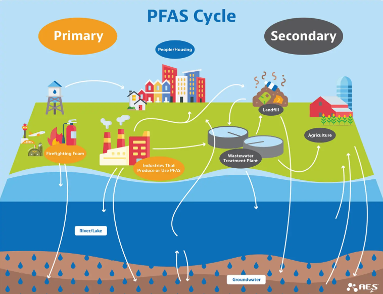PFAS的循环过程。工业生产、消防泡沫是产生和释放PFAS的主要途径,它们经由人类活动排放进入自然环境,对环境造成持续影响。| AE2S