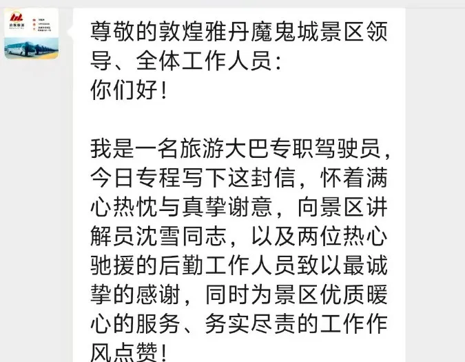 一纸感谢信,字字皆真情;一次暖心事,满满责任心。近日,敦煌雅丹国家地质公园收到一封满载诚挚谢意的感谢信,旅游大巴驾驶员刘师傅,用质朴真诚的文字,讲述了景区工作人员暖心救助、高效担当的动人瞬间,也生动彰显了景区党建引领下的优质文旅服务形象。