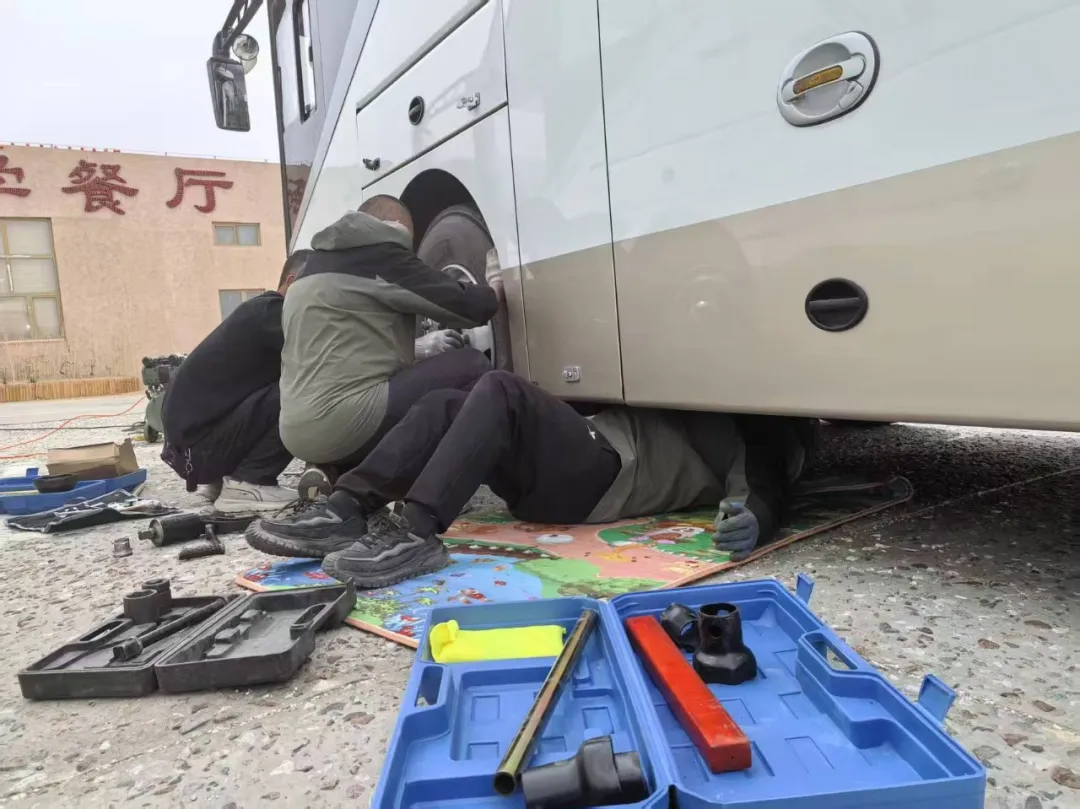 很快,景区后勤工作人员樊海春、雷宏书,带着专业换胎维修工具赶到了现场。两个人分工配合、操作熟练规范,架好安全防护、排查轮胎问题、拆下破损轮胎、换上全新备胎,每一步都稳扎稳打、专业利落。全程不怕脏、不怕累,任劳任怨,没有半句抱怨,一心只为尽快帮司机脱困、保障游客行程。没多久,车辆故障就被彻底排除,安全隐患全部消除,大巴车顺利恢复正常行驶。因为这次及时高效的救援,32名新加坡华人游客没有耽误行程,顺利进入景区游玩,完整打卡了雅丹绝美戈壁风光,圆满完成了这次旅程。