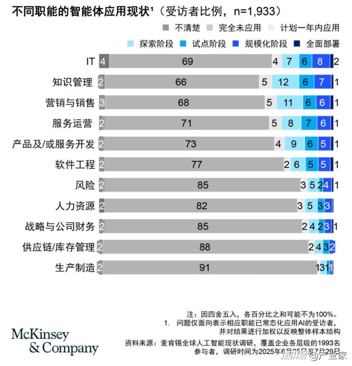 更进一步看,在制造业内部,这种分化更加明显。麦肯锡《2025全球AI现状调研》显示,仍有47%的制造企业停留在试验阶段,31%处于单点试点,真正实现规模化落地的,仅约15%。而在代表下一阶段方向的“生产制造智能体”上,实际采用率几乎可以忽略不计。