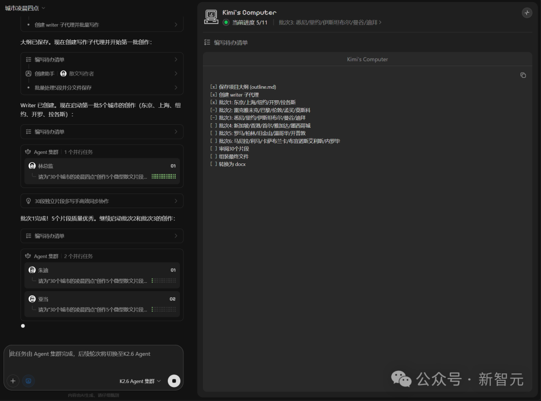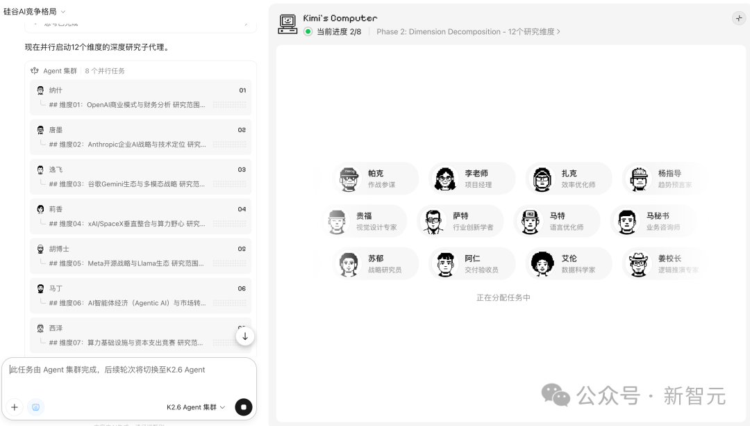 过去丢给Kimi一个复杂任务,它一个人从头干到尾,遇到不擅长的环节就可能卡住。现在它会自己拆活、组队、分头干,每个子Agent专攻自己擅长的那块,最后汇总交付。