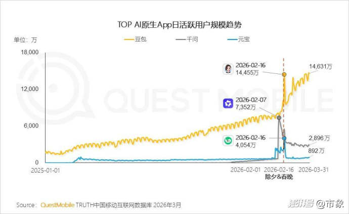 在春节期间,千问的用户体量飞涨,节后立即遭遇回落,而豆包的日活用户规模持续走高。QuestMobile数据显示,春节高峰过后,豆包DAU维持在1.4亿左右,千问和元宝分别为3000万和900万。