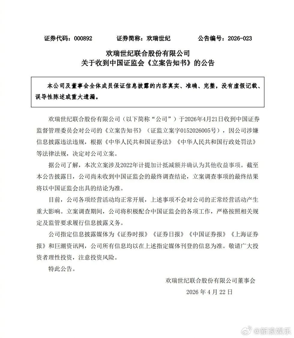 欢瑞世纪公告,公司于2026年4月21日收到中国证监会《立案告知书》。因公司涉嫌信息披露违法违规,证监会决定对公司立案。据了解,本次立案涉及2022年计提加计抵减额并确认为其他收益事项。截至公告披露日,公司尚未收到证监会的最终调查结论,最终结果以证监会出具的结论为准。