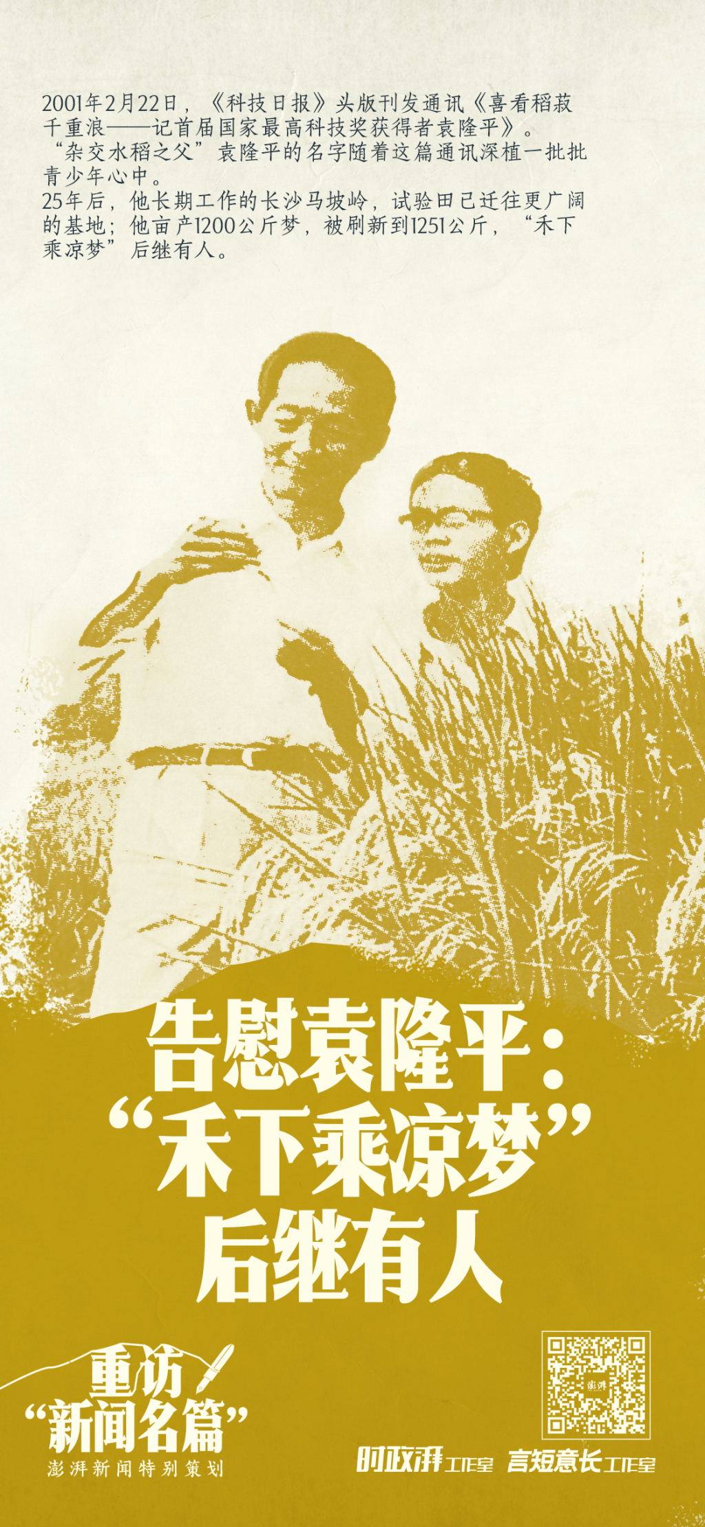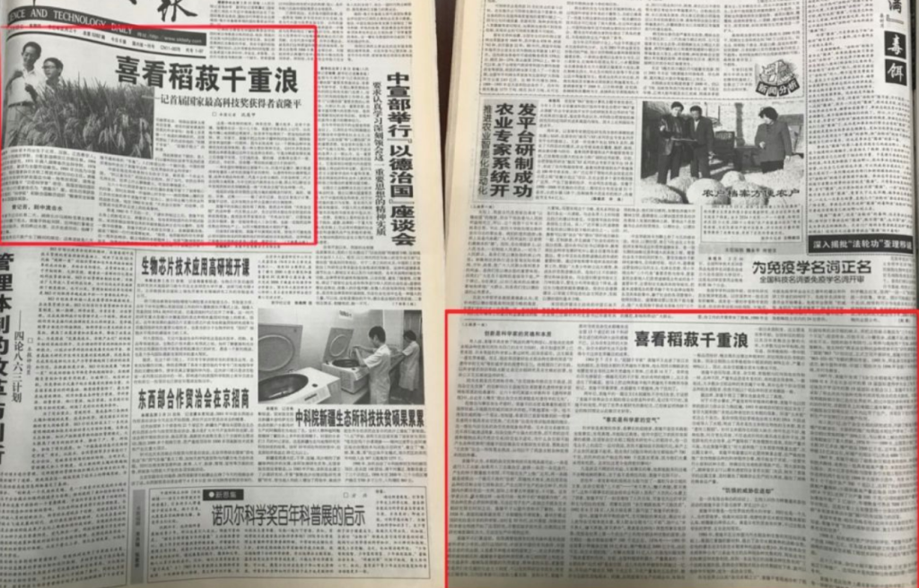 2001年2月22日,《科技日报》头版刊发了由著名科普作家、时任《科技日报》机动记者部主任沈英甲采写的人物通讯《喜看稻菽千重浪——记首届国家最高科技奖获得者袁隆平》(以下简称《喜看稻菽千重浪》)。
