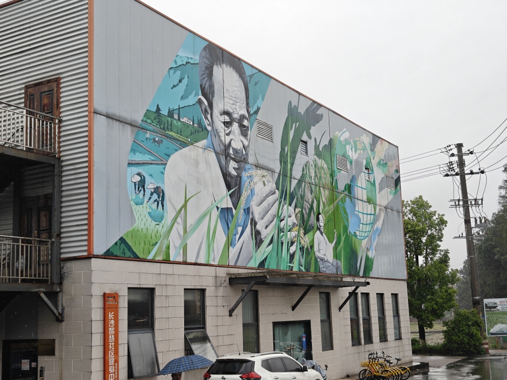 试验田对面的建筑墙面上,是一幅袁隆平查看稻穗的图画。