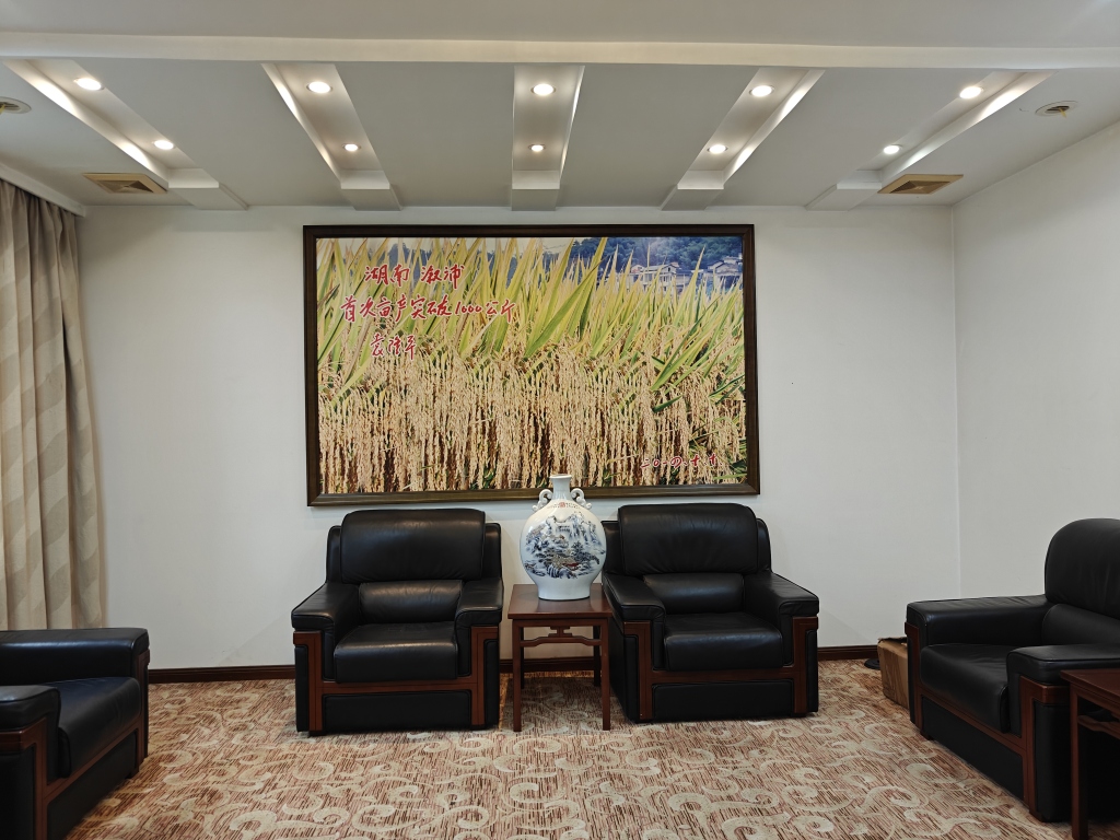 袁隆平生前办公室旁的会客厅内,有一幅稻穗图,上面写有“湖南溆浦 首次亩产突破1000公斤”。
