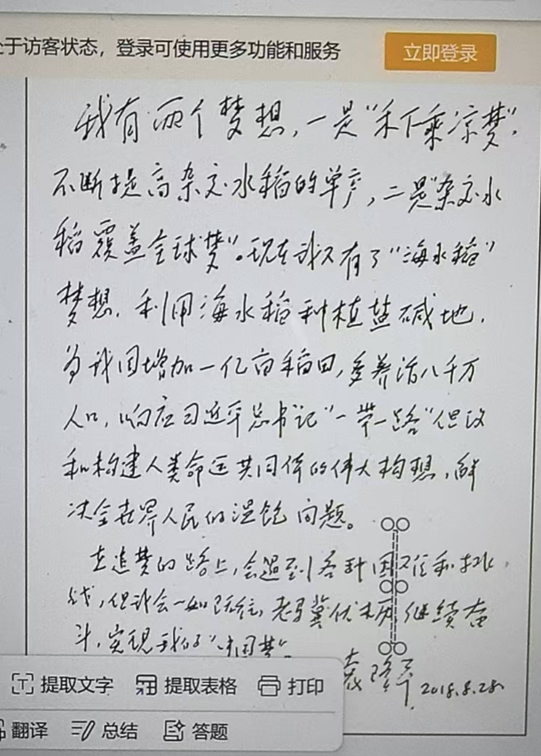 袁隆平2018年亲笔写下的三个梦想。湖南杂交水稻研究中心 供图
