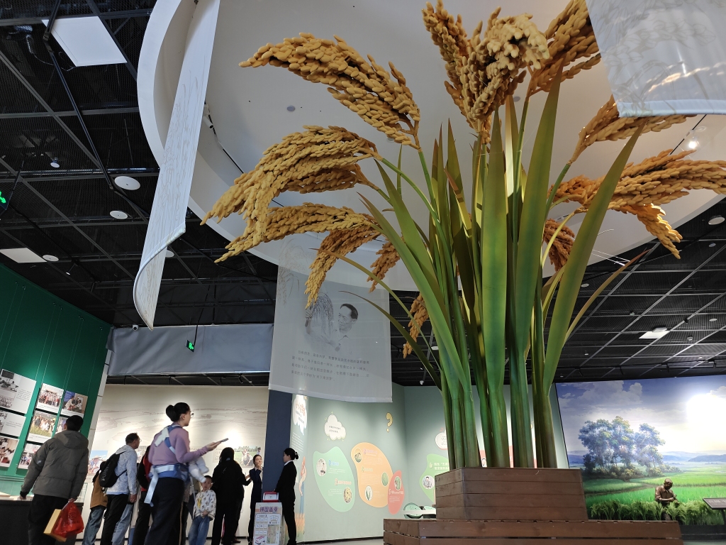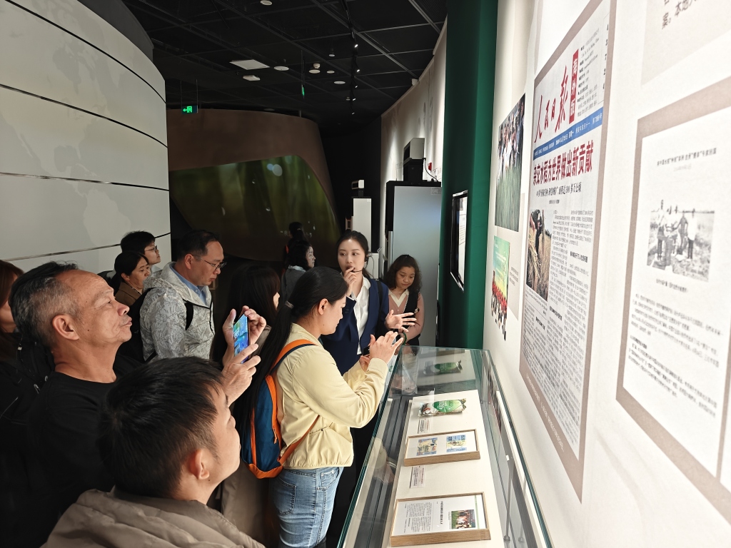 隆平水稻博物馆内,讲解员带领游客了解杂交水稻为世界所作的贡献。
