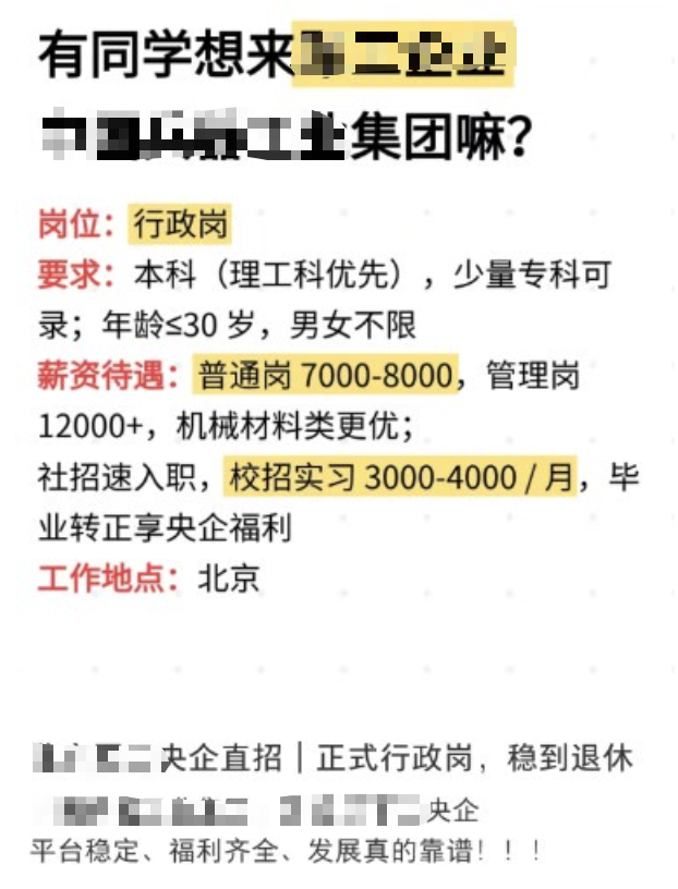 “某局招人,企业编制太香了!”“某集团,内推优先安排”“某集团,央企直签招人”……一家人力资源公司账号的主页上,不乏央企国企工作岗位信息。这些信息,不仅标注出具体岗位、薪资待遇、相关要求,更用诸如“先到先得”“入职即签订正式劳动合同”“1周面试,3到5天上岗”等字眼诱惑用户。