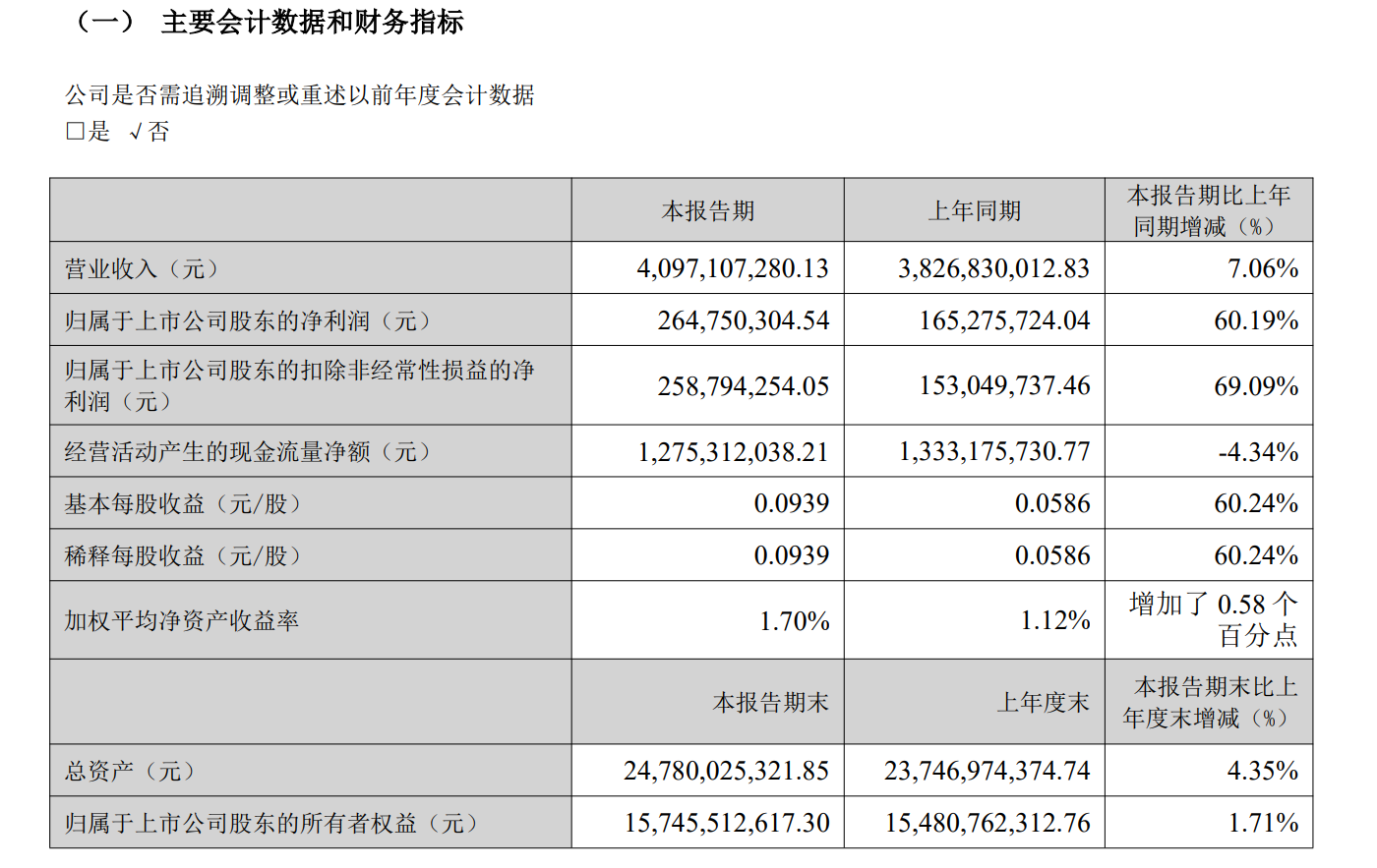 4月23日,北京燕京啤酒股份有限公司(燕京啤酒,000729.SZ)发布2026年第一季度报告,报告期内,公司实现营业收入40.97亿元,同比增长7.06%;归母净利润2.65亿元,同比增长60.19%;扣非归母净利润为2.59亿元,同比增长69.09%。