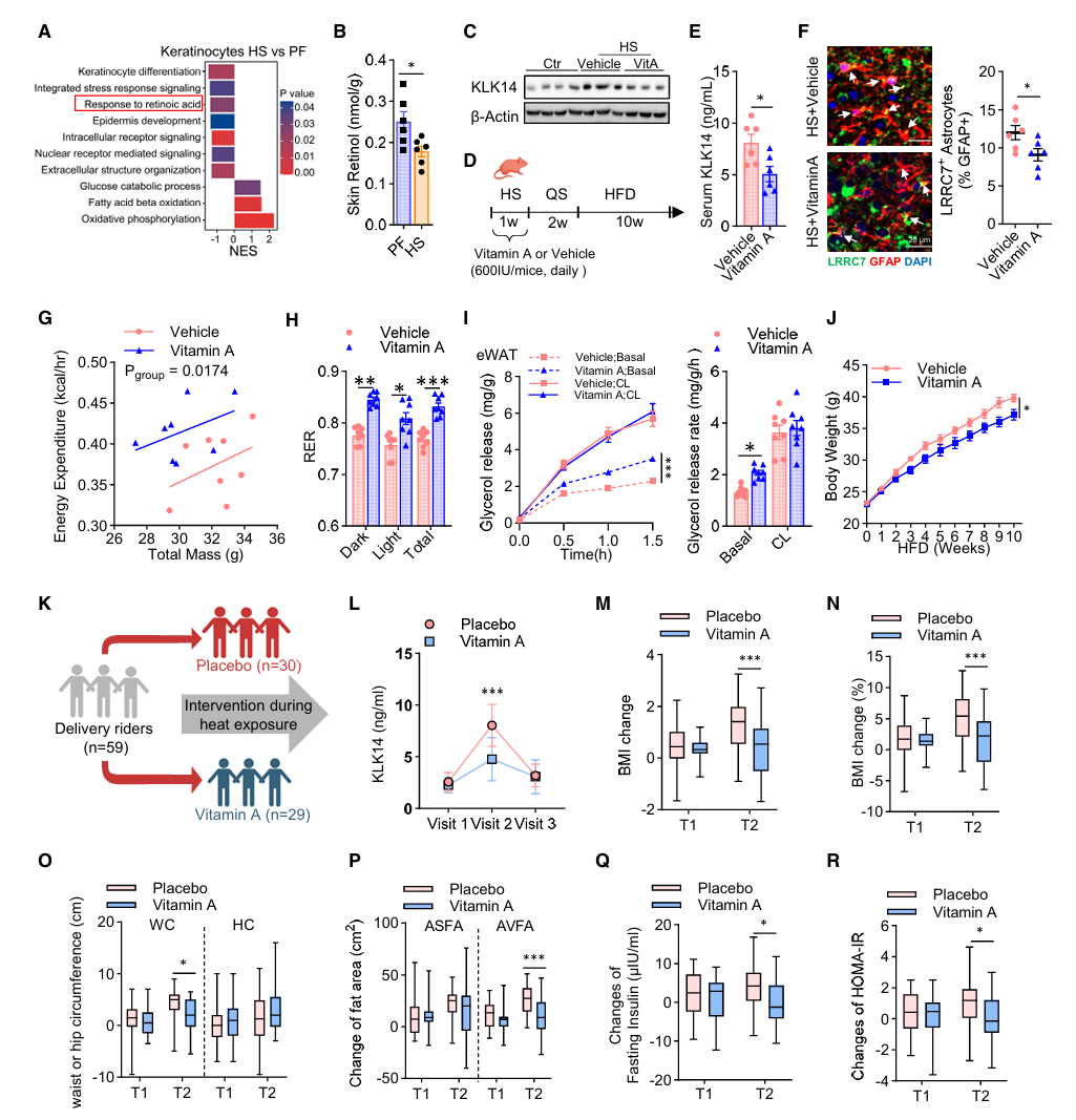 补充维生素A能直接抑制皮肤产生KLK14,减少下丘脑LRRC7⁺细胞数量,恢复能量消耗和脂肪分解。在随机对照临床试验中,给高温作业的外卖员补充维生素A,可显著降低KLK14水平,减缓BMI、腰围、腹脂、胰岛素抵抗的上升。