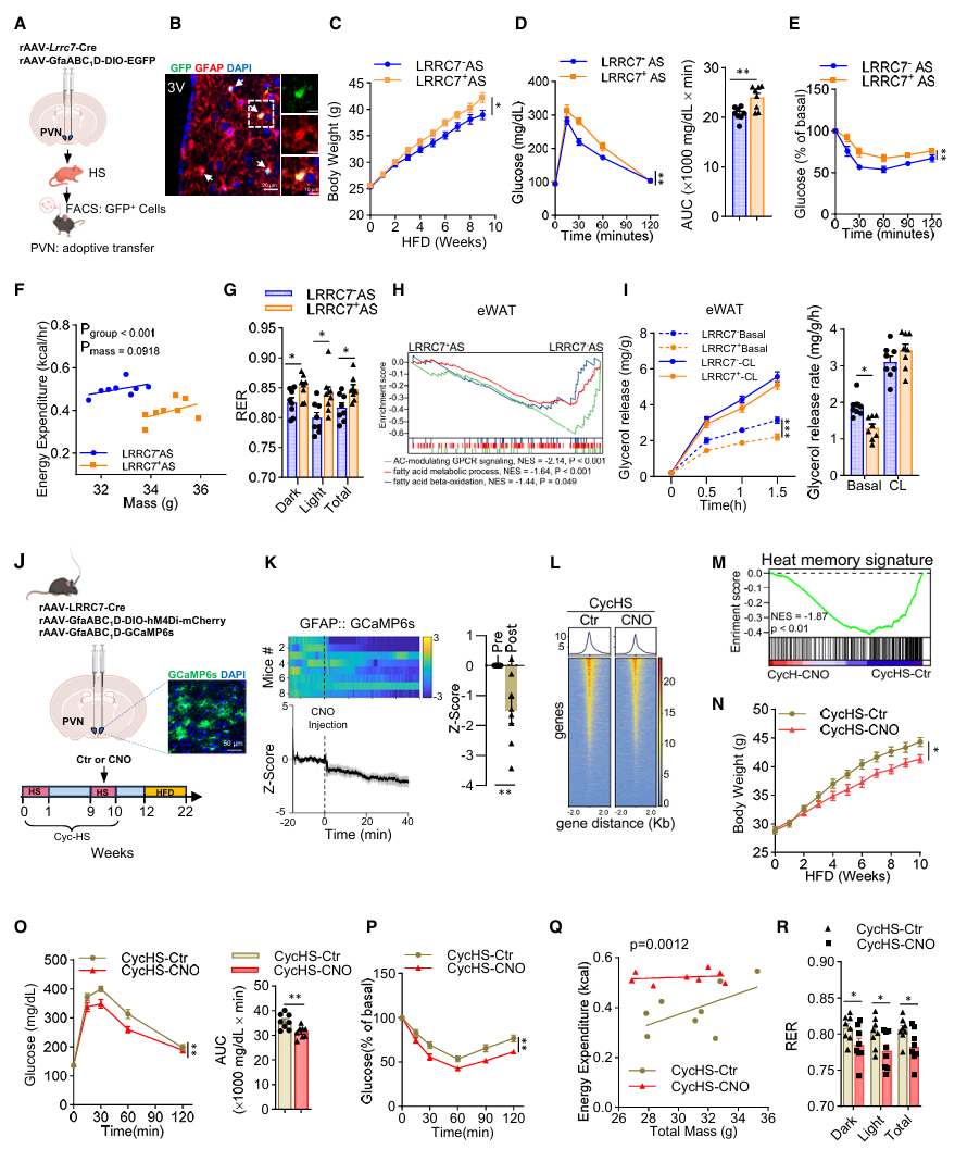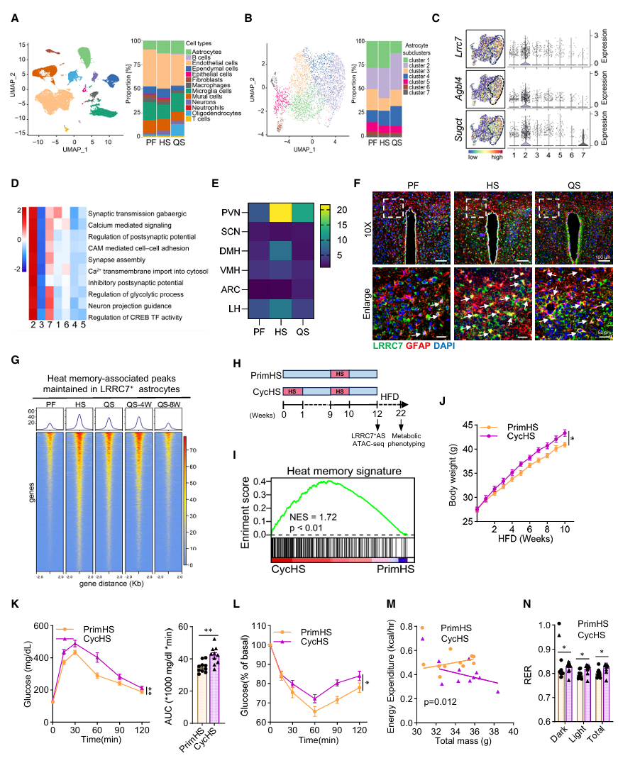 结果显示,下丘脑LRRC7⁺星形胶质细胞的数量明显变多,集中在PVN室旁核;在热应激后这些细胞的染色质持续开放,形成可被“唤醒”的热记忆,至少维持4周;再次热暴露时,热记忆快速激活,小鼠代谢问题更严重;抑制这类细胞,热记忆和代谢损伤都被逆转。