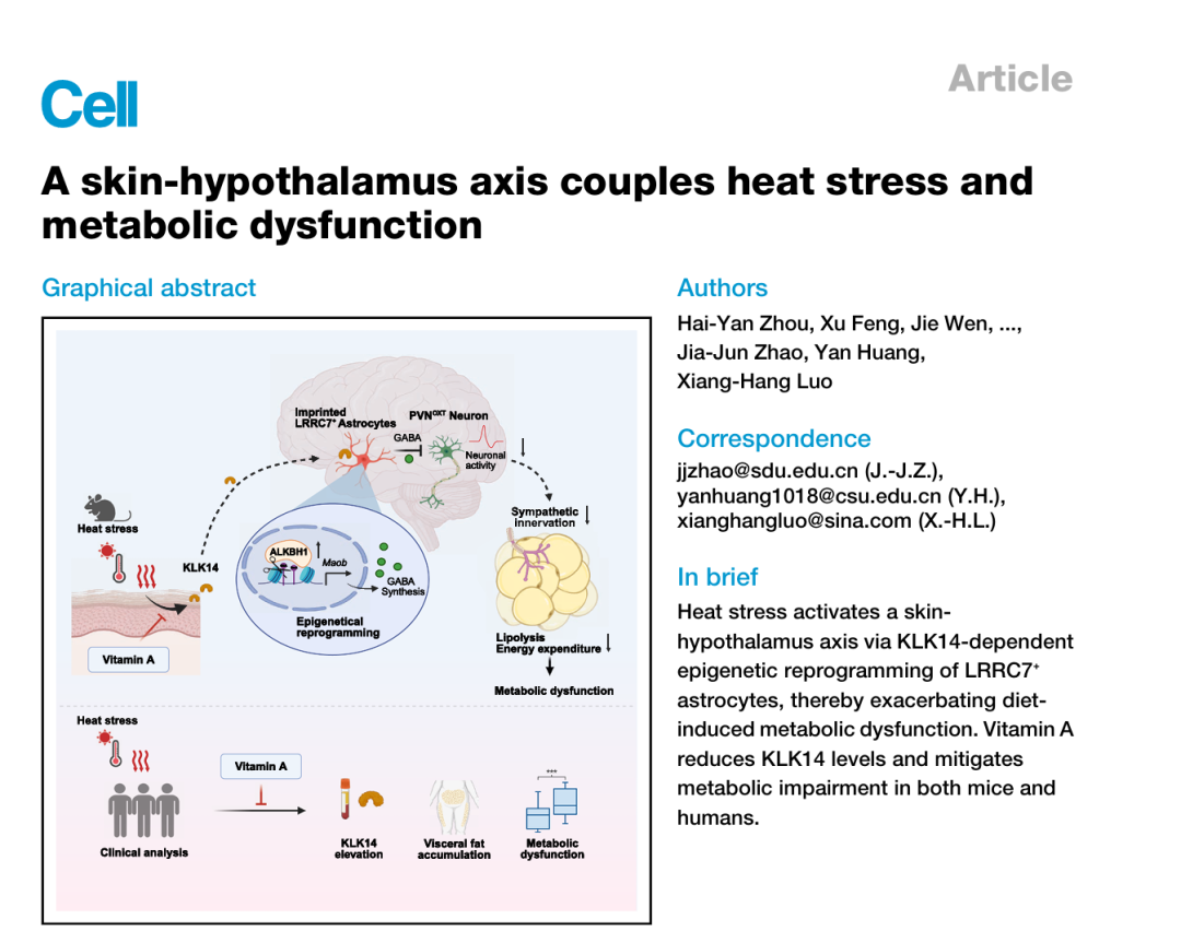 2026年4月21日,中南大学湘雅医院罗湘杭教授、黄燕教授及山东第一医科大学附属省立医院赵家军教授团队,在国际顶刊《Cell》上发表研究《A skin-hypothalamus axis couples heat stress and metabolic dysfunction》。