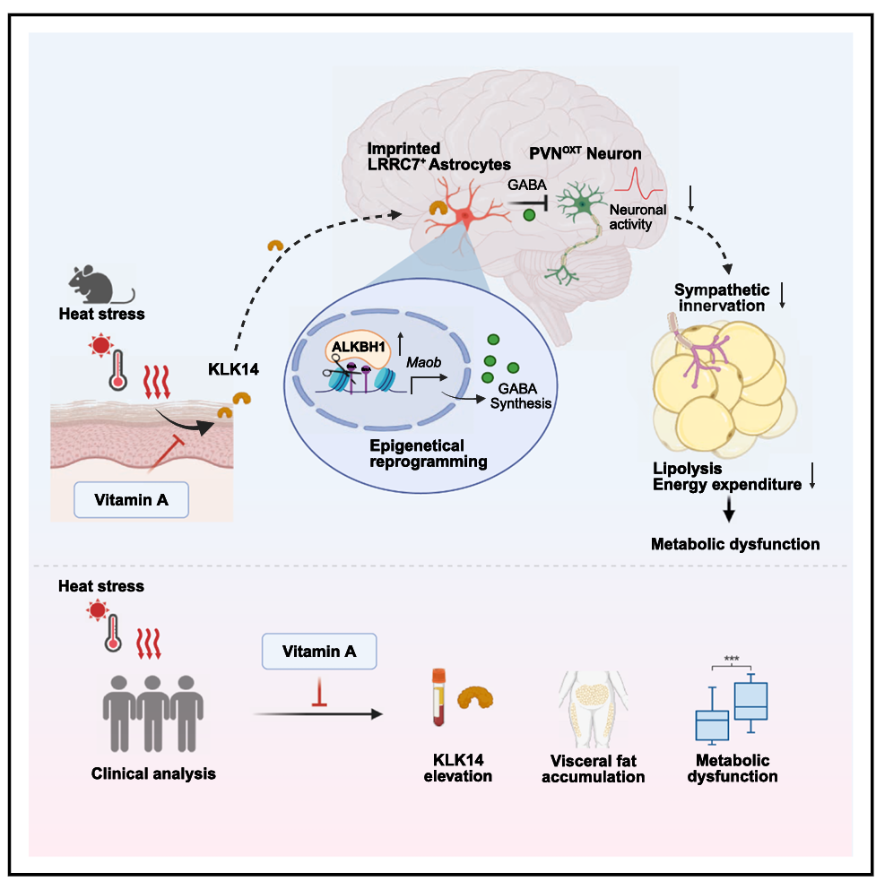 热应激诱导皮肤分泌 KLK14,作用于下丘脑 LRRC7+星形胶质细胞形成表观遗传热记忆,通过 GABA 抑制PVN 催产素神经元 - 交感神经通路,降低脂肪分解、促进肥胖与胰岛素抵抗;