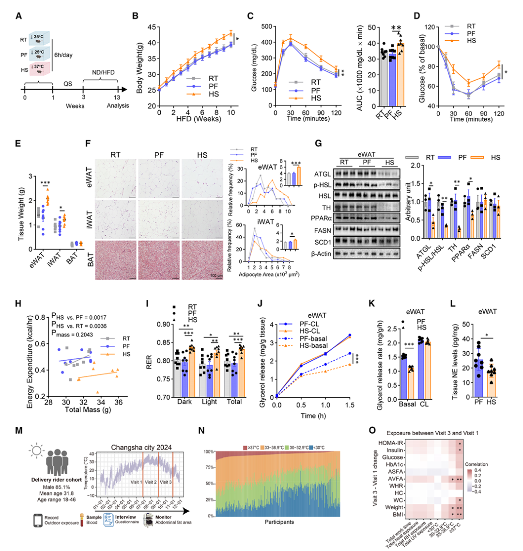 结果显示,热应激小鼠体重、体脂显著增加;糖耐量、胰岛素敏感性变差;脂肪分解能力下降。在长沙外卖员人群中也发现长期高温暴露与体重、BMI、腹型肥胖、胰岛素抵抗升高显著相关。