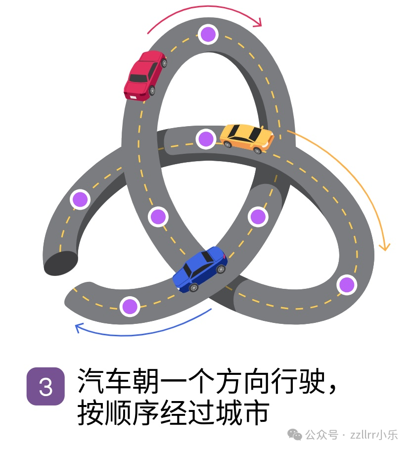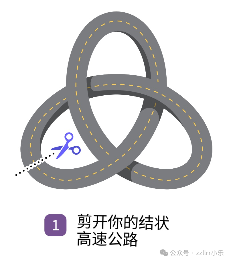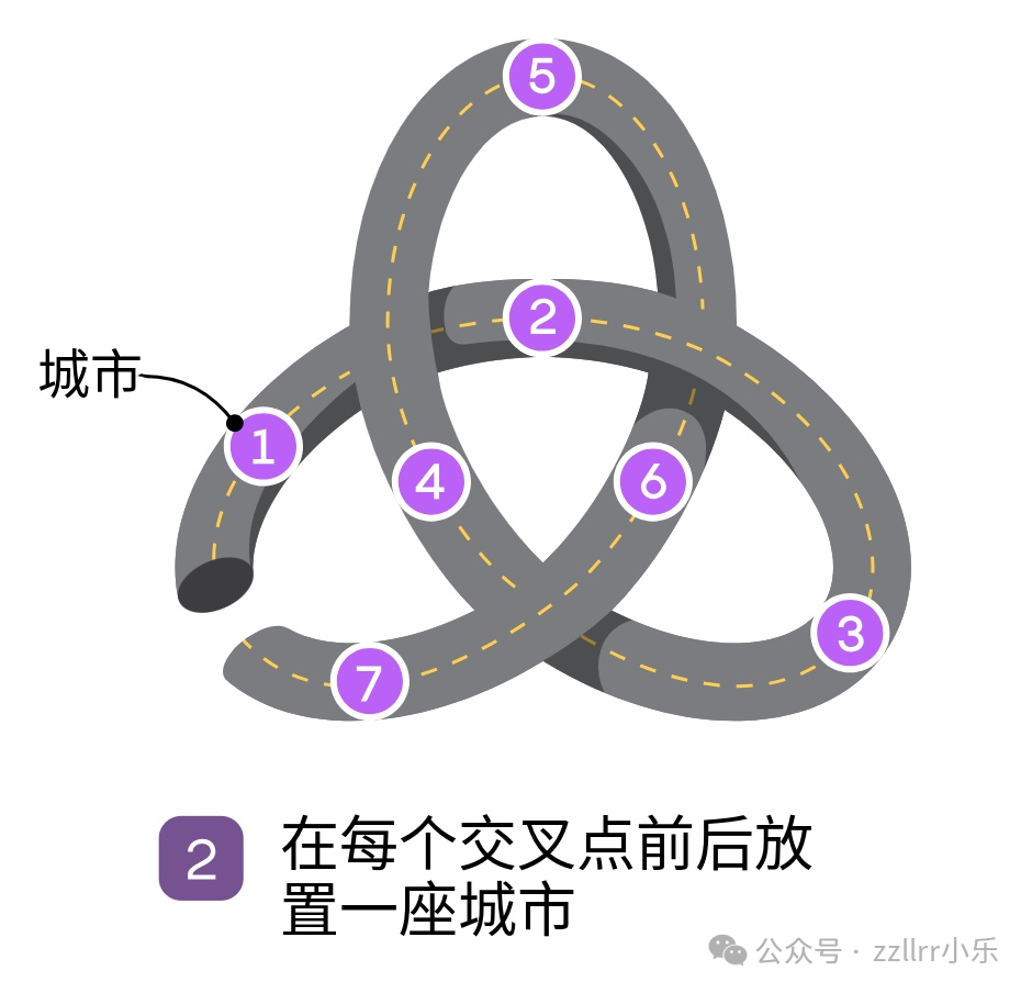 把纽结想象成一条单向高速公路,在某处剪开,使其有起点和终点。再想象每两个交叉点之间都有一座城市。如果一辆车从高速公路起点出发,它会依次驶过每座城市一次,然后从终点驶出。