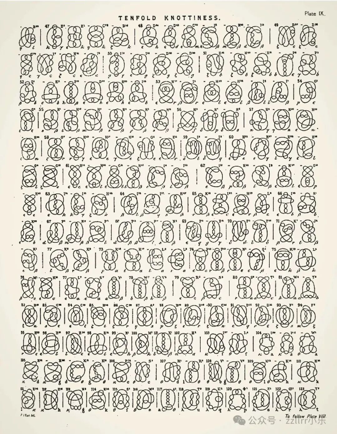 彼得・格思里・泰特(Peter Guthrie Tait)1885 年一篇论文中的一页,他在这篇论文中区分了 10 个交叉点的不同纽结。