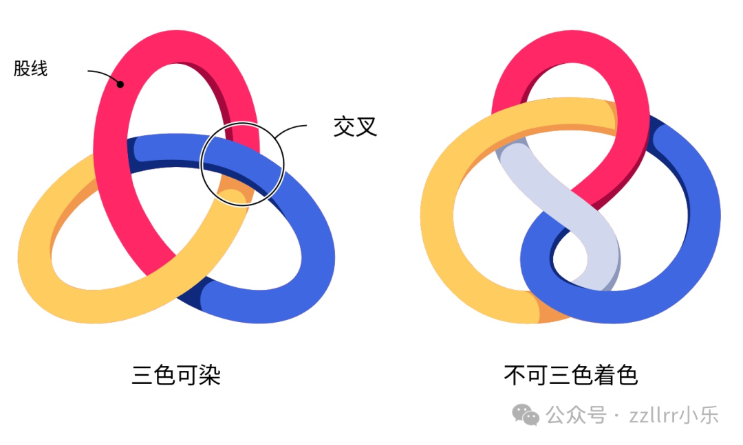 想象一个游戏:你画出一个纽结,尝试用红色、黄色或蓝色为每根绳线染色。规则是必须至少使用每种颜色一次,且在每个交叉点处,要么三种颜色都出现,要么只出现一种。有些纽结可以这样染色,有些则不能 —— 例如,三叶结可以染色,而八字结不行。
