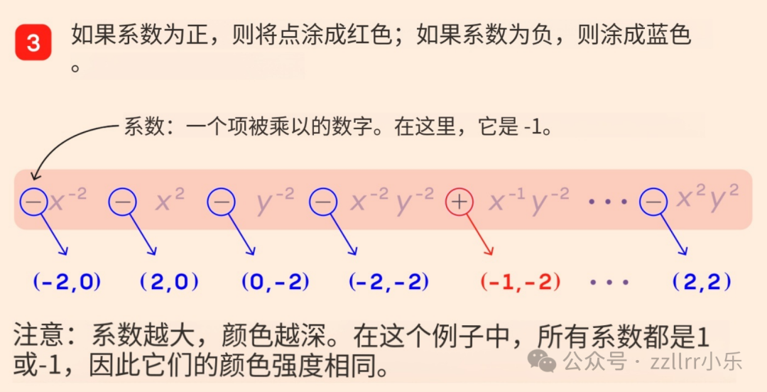 3)系数为正,则将点标为红色,系数为负,则标为蓝色。系数:项所乘的数字,此处为 -1。