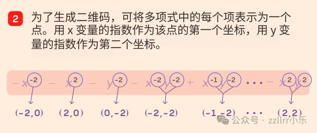 2)要生成二维码,将多项式的每一项表示为一个点。以变量 x 的指数作为点的第一个坐标,变量 y 的指数作为点的第二个坐标。