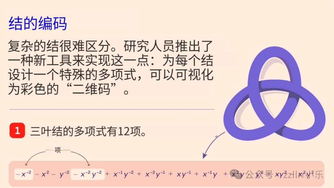 复杂的纽结很难区分。研究人员公布了一种区分方法:为每个纽结生成一个特殊多项式,可将其可视化为彩色 “二维码”。