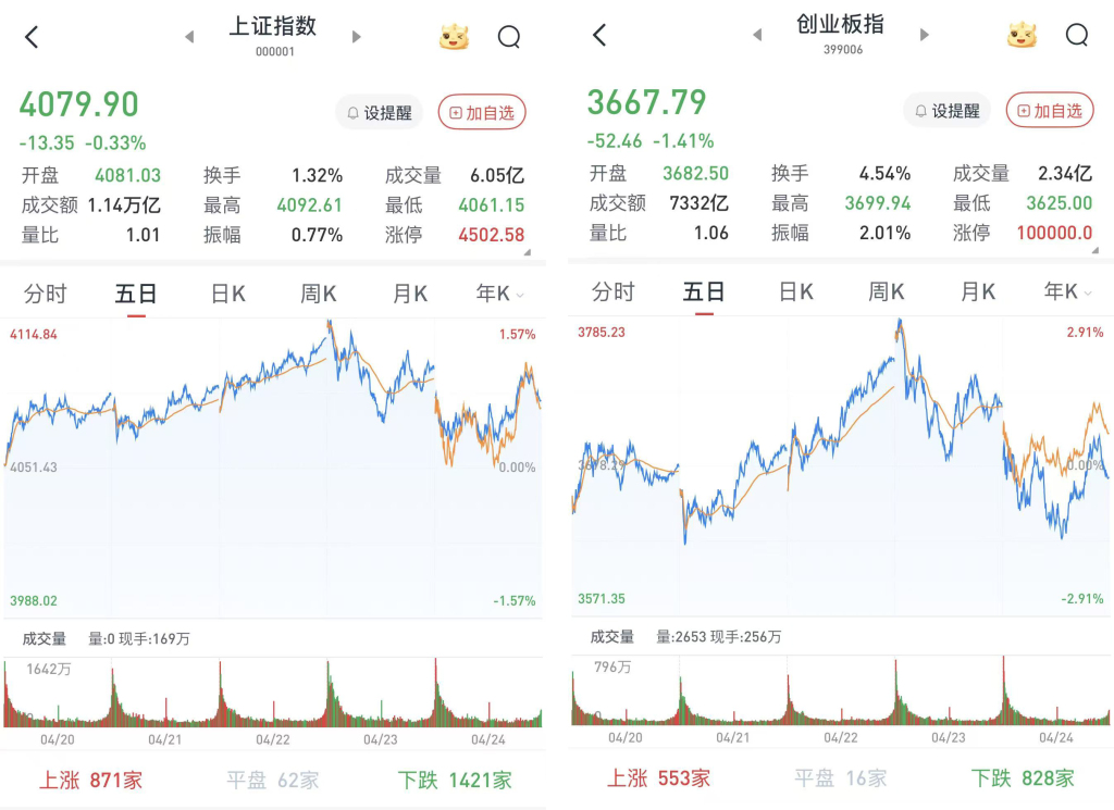 A股三大股指4月24日集体低开。早盘低位震荡,午前跌幅扩大。两市午后回暖,沪指更是一度接近平盘。