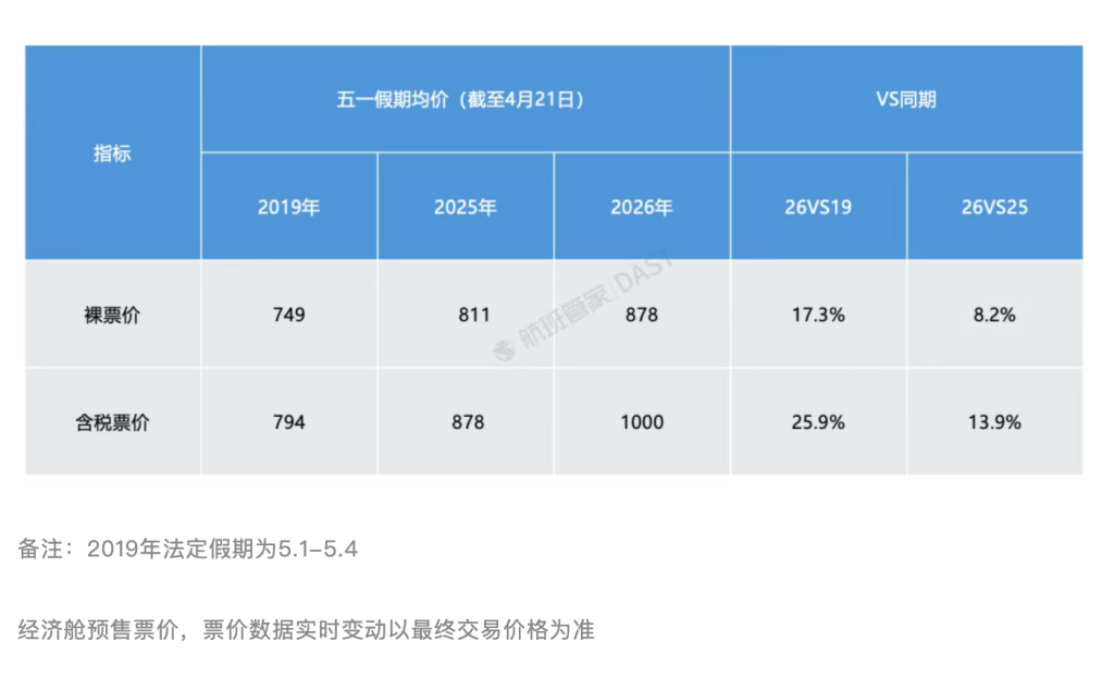 假期票价方面,航班管家数据显示,截至4月22日,今年国内含税票价为1000元,同比增13.9%,较2019年同期增25.9%。