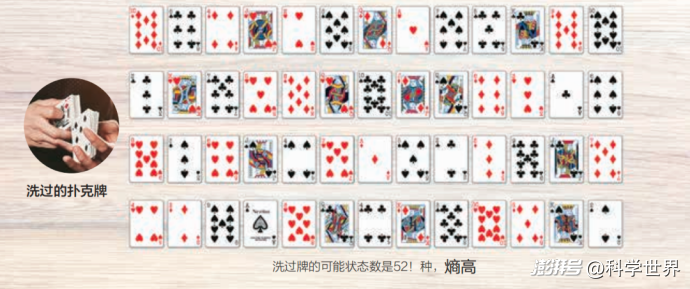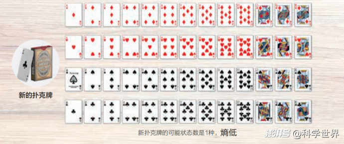扑克牌的排列组合数量,可以被视作扑克牌所拥有的“可能状态数”。这个数字反映了扑克牌的熵*。一副全新的扑克牌,因其排列只有1种可能,所以可能状态数为1,熵值相对较低。相对地,洗乱后的扑克牌,排列组合接近4x10^67种可能,因此具有更高的熵值。