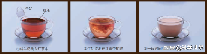 当我们把3毫升的牛奶倒进150毫升的红茶里,牛奶分子在微观层面上会经历什么变化呢?一开始,牛奶几乎完全没有与红茶混合,此时,牛奶分子被限制在大约3毫升的狭小空间内,可供它们存在的可能状态非常有限。这时,因为可能的状态数量很少,系统的熵值相对较低。换句话说,牛奶分子在有限体积内的分布状态更加有序。由于有序状态对应的可能状态数较少,因此这种状态的熵也较低。