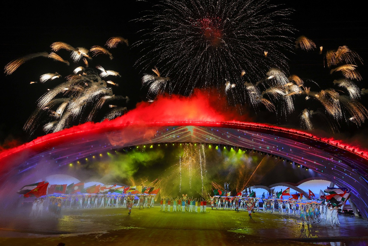 本届亚沙会实现了亚洲45个国家和地区全部报名参赛的“全家福”式团聚。1635名运动员、924名代表团官员和622名技术官员齐聚三亚。开幕式上,各代表团伴随《请到天涯海角来》的旋律,从开放型滨海剧场中“踏浪而来”,呈现出“客从海上来”的独特场景。