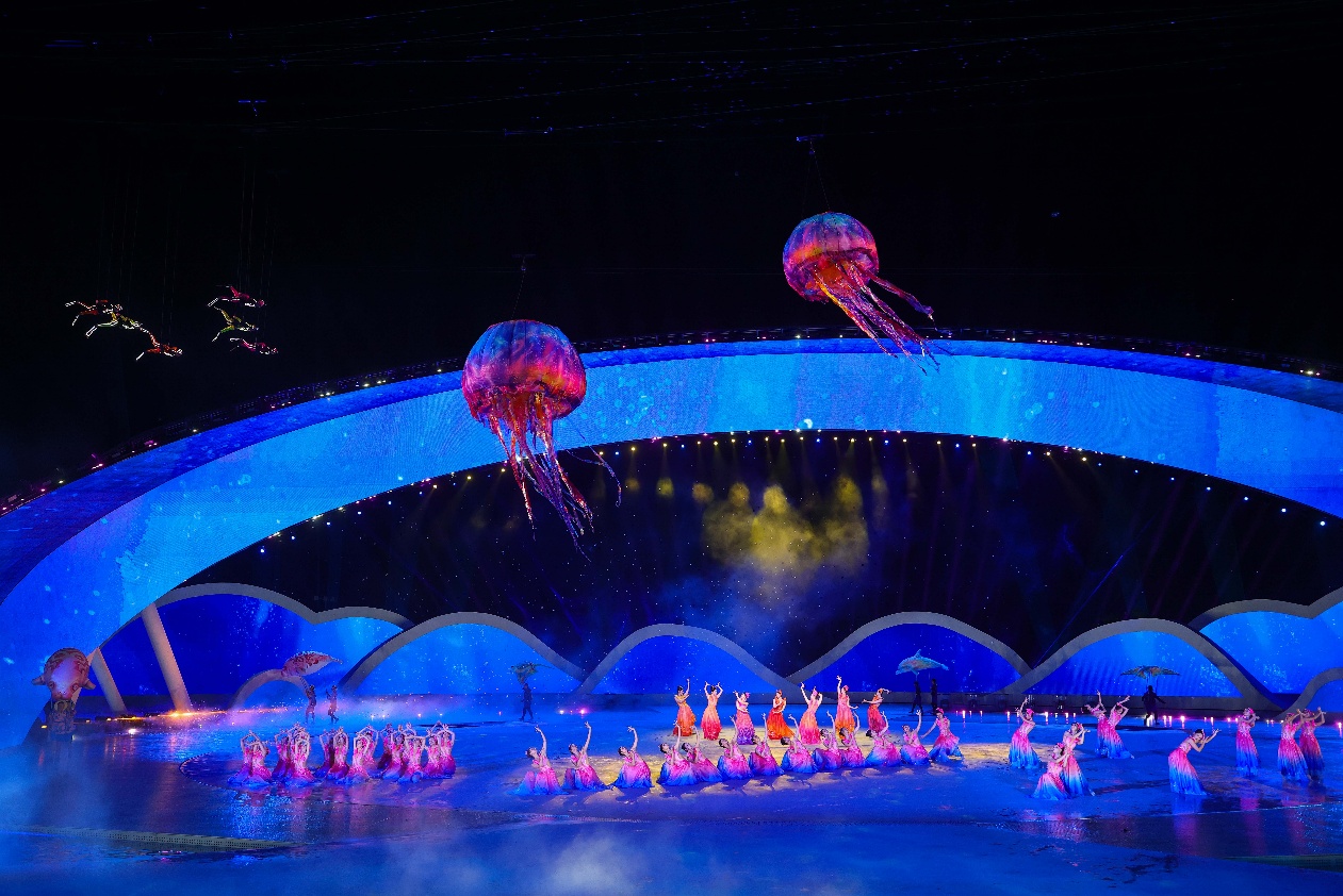 开幕式上,“深海逐梦”篇章将绿色理念推向情感层面。充气水母、儒艮、海龟等海洋生物“游”进演出现场,与观众贴脸互动,直观传递“人与自然和谐共生”的海南态度。焰火表演选用低烟环保烟花,在夜空绽放的同时最大限度降低环境影响。