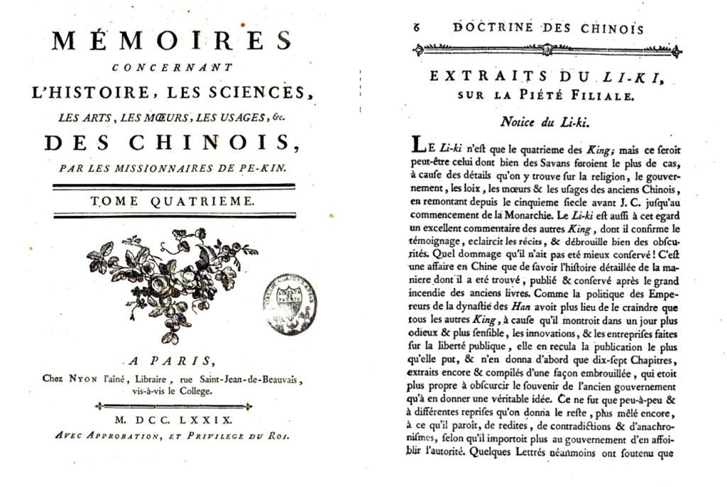 真正走出教会内部进入公共阅读领域的《礼记》译本是由法国耶稣会士韩国英(Pierre-Martial Cibot, 1727-1780)完成的。该译本发表在欧洲汉学三大巨著之一的《中国杂纂》(Mémoires Concernant l'Histoire, les Sciences, Les Arts, Les Moeurs, les Usages etc Des Chinois)第4卷中(1779年)中,题为《礼记摘录-有关孝道》(Extraits du Li-Ki,sur la Piete Filiale),在对《礼记》进行简单介绍后,共计翻译了23章,多为摘译,包括《曲礼》、《檀弓》、《王制》、《曾子问》等,其中《曲礼》内容较多,向欧洲读者介绍了诸多礼仪细节,该译本按照源文本进行了排序,其中常有章节合并,多泛译,并鉴于礼仪之争的影响,他对其中的敏感内容也进行了删减。韩国英的译本作为第一部在欧洲出版的《礼记》译本,补充了18世纪欧洲“中国热”的背景下中国知识内涵,也将《礼记》从“礼仪之争”的阴影中摆脱出来,进一步凸显了该典籍的知识性和大众性。