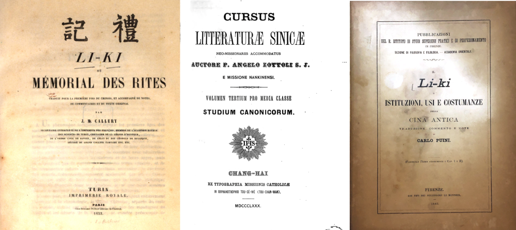 与加略利、晁德蒞这种侨居地汉学家不同,意大利东方学家普意尼(Carlo Puini,1839-1924)从未有在中国生活的直接经验,他对中国的认识都源自书本。普意尼曾在《意大利东方研究简报》上发表多篇文章讨论了中国的宗教、历史、哲学和文学,并进行了《礼记》摘译,分别是《〈礼记〉或中国古代的制度、习俗和礼仪》(Il Li-Ki o Istituzioni,Usi e Costumanze della Cina Antica,1883)和《〈礼记〉中关于宗教的三篇》(Tre Capitoli del Li-Ki Concernenti la Religione,1886),前者讨论了《礼记》的成书和内容,在对加略利译本进行肯定的同时又认为其摘译无法为学界提供完整及精确的信息,而他选择《曲礼上》、《曲礼下》进行翻译是因为这两章是《礼记》中最古老的,蕴含了丰富的古代社会信息。该译文及附录涉及的汉字和中文名字借鉴了美国汉学家卫三畏(Samuel Wells Williams,1812-1884)的字典。后者包括《祭法》、《祭义》、《祭统》,并在译文结束后附有《之于古代文明社会制度比较研究的贡献》(Contribuzioni allo Studio Comparativo delle Istituzioni Sociali nelle Antiche Civiltà)。普意尼对翻译《礼记》有长久的规划,都与其研究主题紧密相关,但后续却未再出版相关译文。