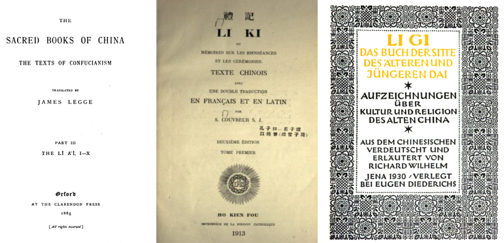 《礼记》的全译本出现在19世纪末,分别是英国汉学家理雅各(James Legge,1815-1897)的《中国圣书:第三部分〈礼记〉》(The Sacred Books of China.The Texts of Confucianism,Part III,The Lĭ Kĭ,I-X,1885)和法国汉学家顾赛芬(Séraphin Couvreur,1835-1919)的《礼记或礼仪、典礼记录》(Li Ki ou Mémoires sur les Bienséances et les Cérémonies Texte chinois avec une double traduction en français et en latin,1899)。理雅各译本属于东方学家马克斯·缪勒(Max Müller,1823-1900)编辑的《东方圣书》系列的一部分,其目标是把亚洲的宗教哲学经典译为英语,并借以语言比较和宗教比较来理解宗教内涵。理雅各负责的是中国儒家和道家部分,包括《礼记》、《老子》和《庄子》。理雅各在翻译时附加了脚注,并通过选择合适的评注底本,将西方汉学与中国礼学进行了有效地联结。而顾赛芬的《礼记》译本是中法拉对照,具体为中文原文-汉语注音-法语译文,注释部分则是法语释疑混合了拉丁语翻译,出版地为河间府,为彼时影响较大的基督教在华出版机构之一,尤为擅长中西合璧的印刷方式。从顾赛芬《礼记》译本中增加的注音部分以及最后所附的汉字索引,可以推断出该书与晁德莅的《礼记》类似,即作为汉语学习的教科书,顾赛芬的译文古典文雅,备受汉学家好评。