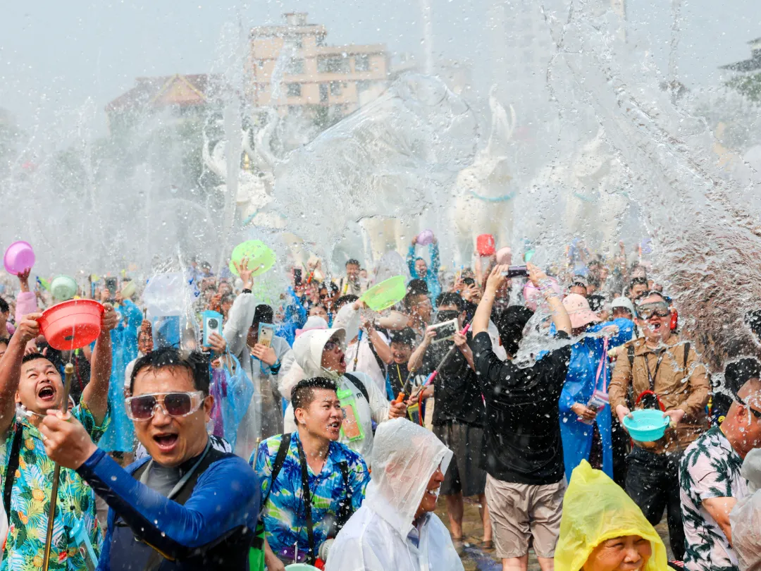 泼水狂欢如期而至,傣族电音响起,人群边跳边泼,整座城市从广场一路“湿”到街头巷尾。